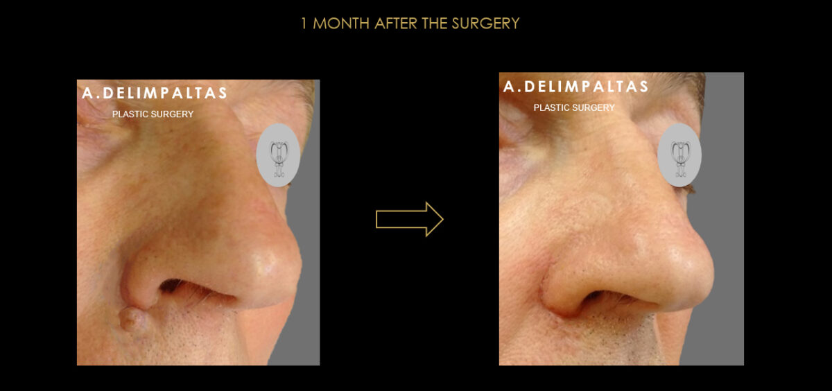 Man with benign pigmented skin lesion (mole), at the junction of the upper lip with the right alar of the nose