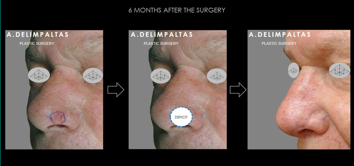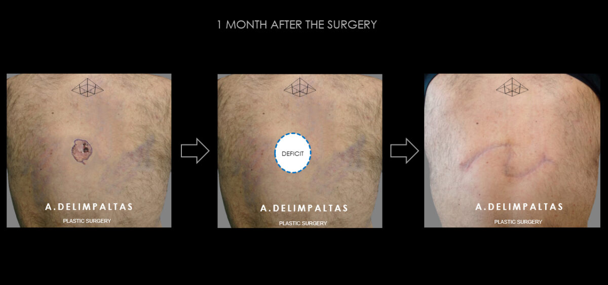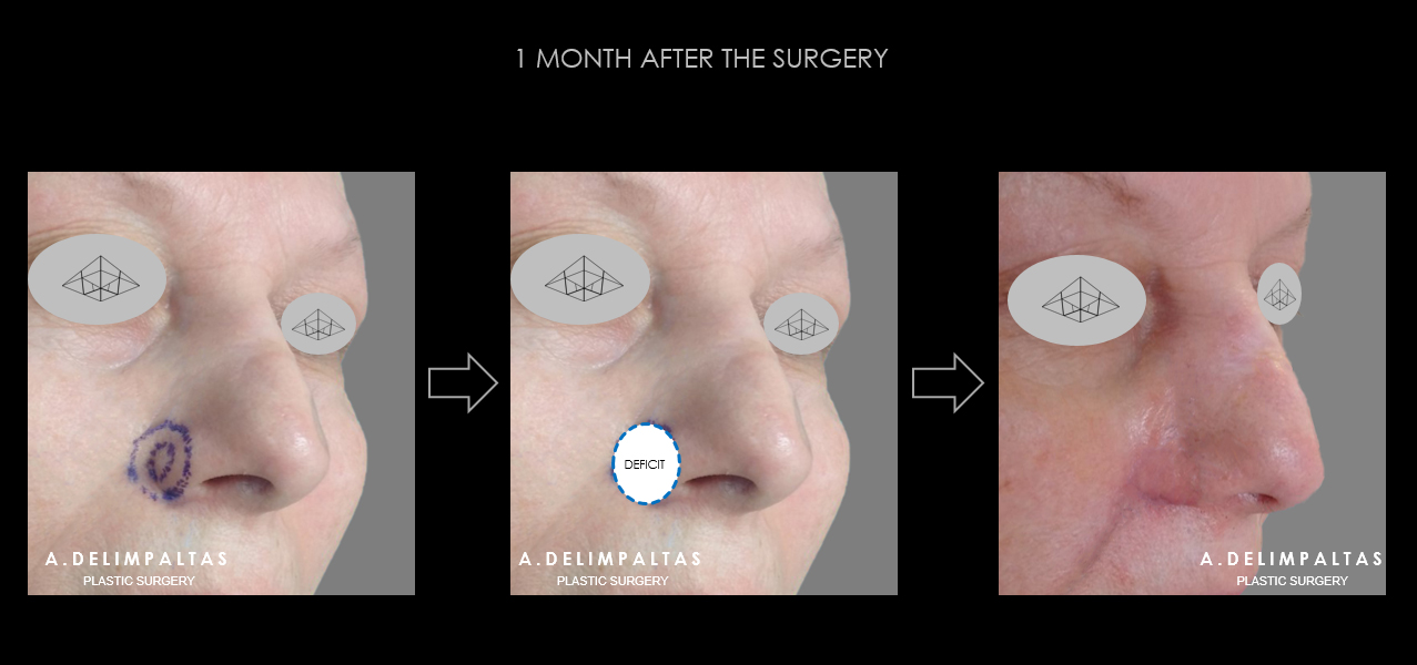 Resection of the lesion to healthy margins according to international protocols and restoration functional and aesthetic of the affected area with technique of rotation-advancement of surrounding healthy tissue