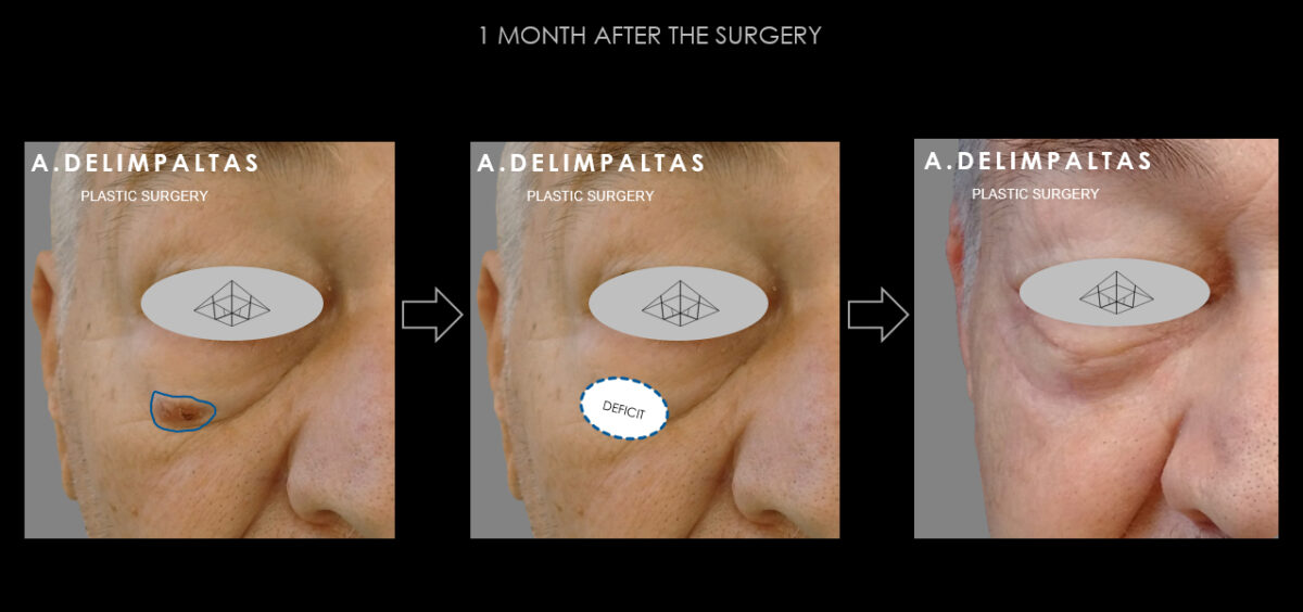 Resection of the lesion to healthy margins according to international protocols and restoration functional and aesthetic of the affected area with technique of displacement-advancement of surrounding healthy tissue in combination with reverse unilateral rhytidoplasty (reverse unilateral face lift)