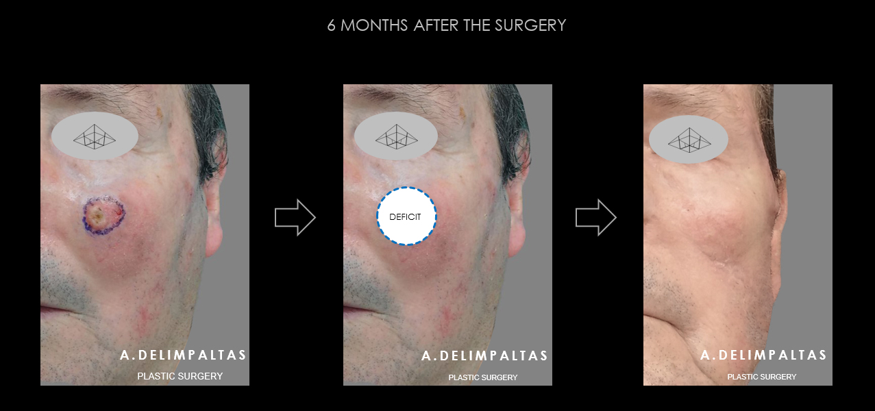 Resection of the lesion to healthy margins according to international protocols and restoration functional and aesthetic of the affected area with technique of displacement-advancement of surrounding healthy tissue