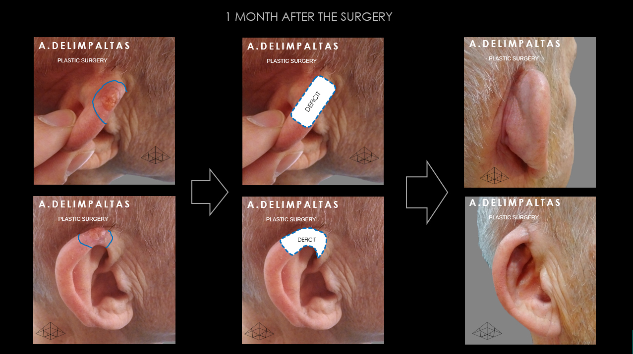Resection of the lesion to healthy margins according to international protocols and restoration functional and aesthetic of the affected area with advanced technique of transferring self-feeding healthy tissue from the posterior region of the auricle