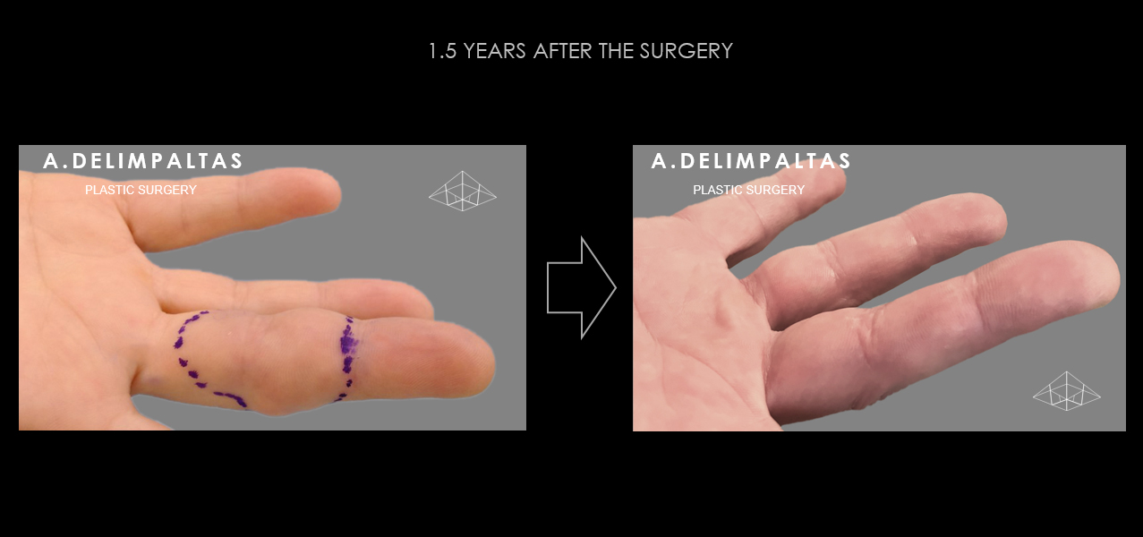 Radical removal of the lesion with functional and aesthetic restoration (complete sensibility and mobility of the finger without recurrence)