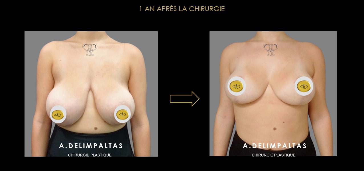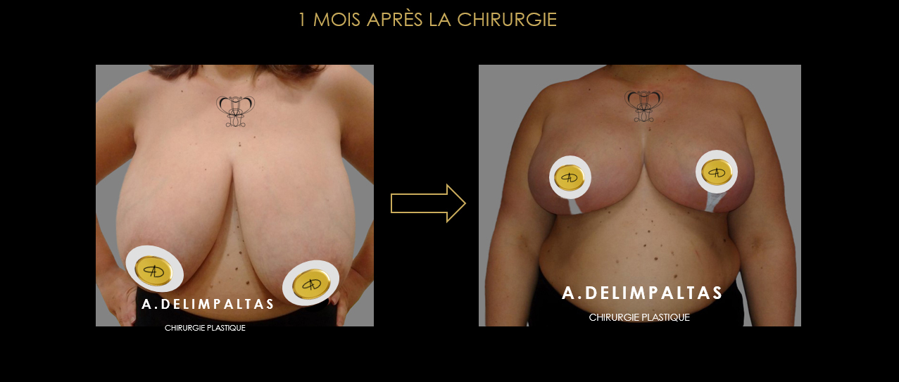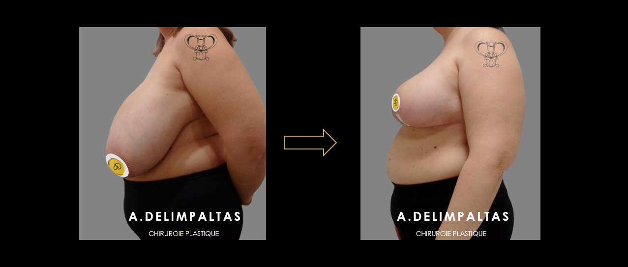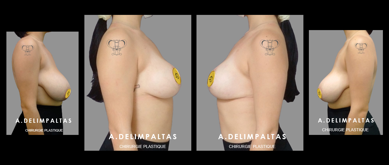 Jeune femme <40 ans après grossesse gémellaire FIV. Seins extrêmement gros (gigantomastie), asymétrie, très grosse chute