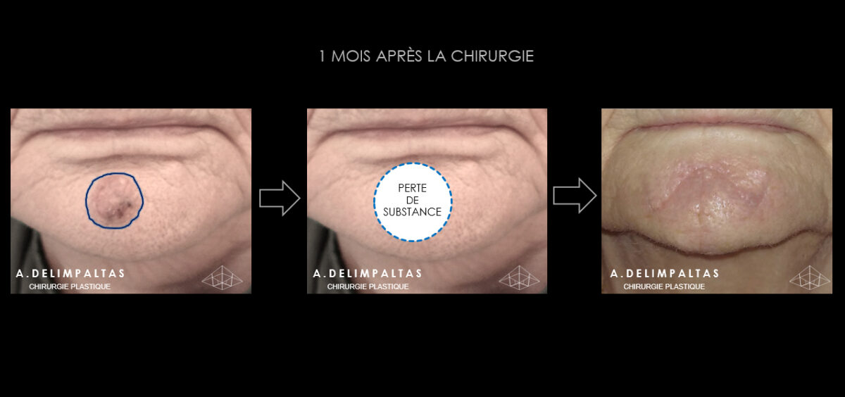 Résection de la lésion en marges saines selon les protocoles internationaux et restauration fonctionnelle et esthétique de la zone affectée avec technique de déplacement-avancement du tissu sain voisin