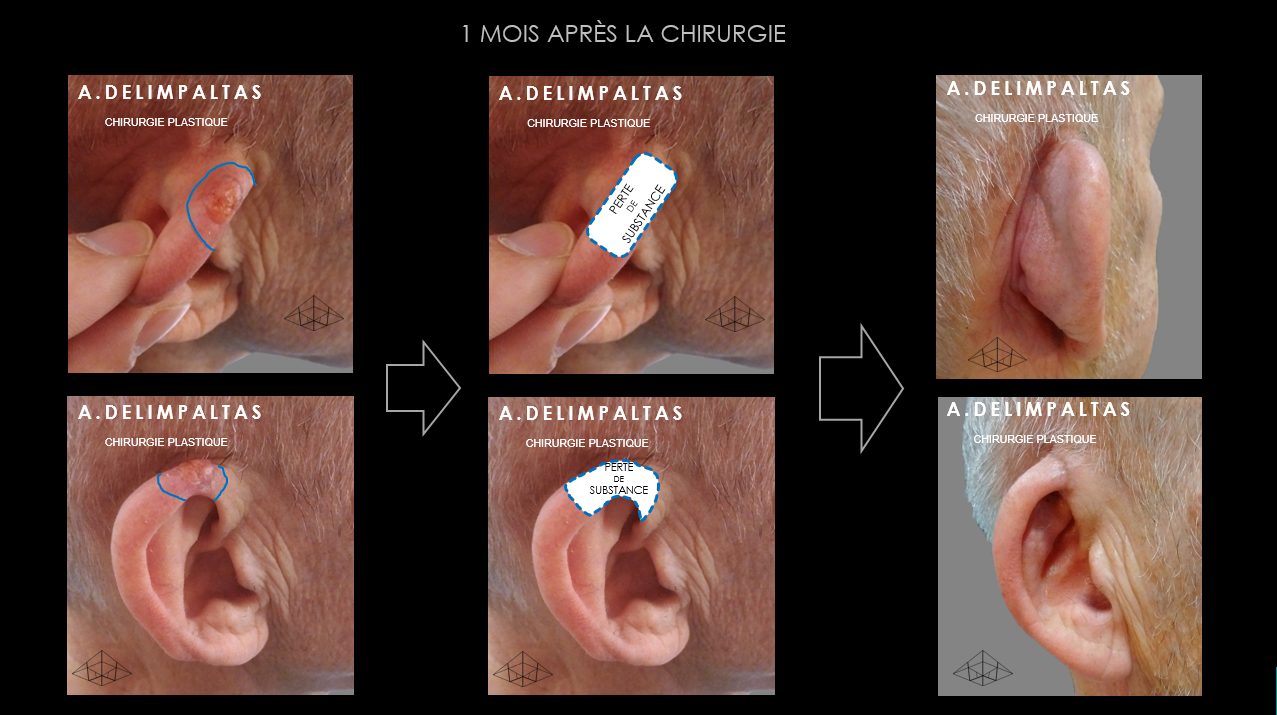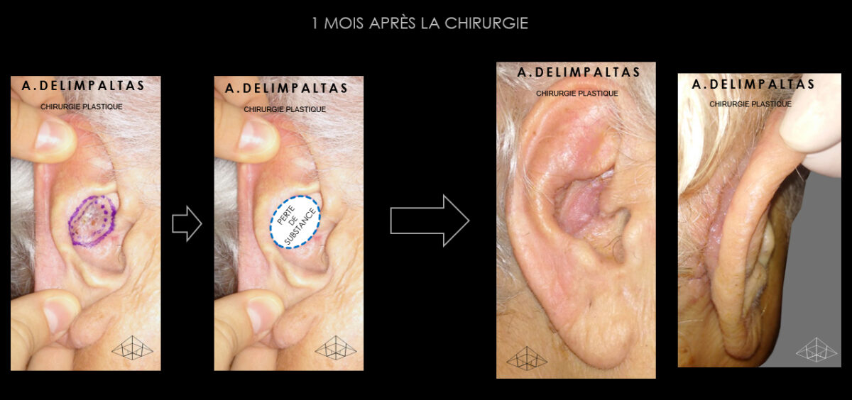 Résection de la lésion en marges saines selon les protocoles internationaux et restauration fonctionnelle et esthétique de la zone affectée avec une technique avancée de transfert de tissu sain auto-alimenté de la région postérieure de l’oreille